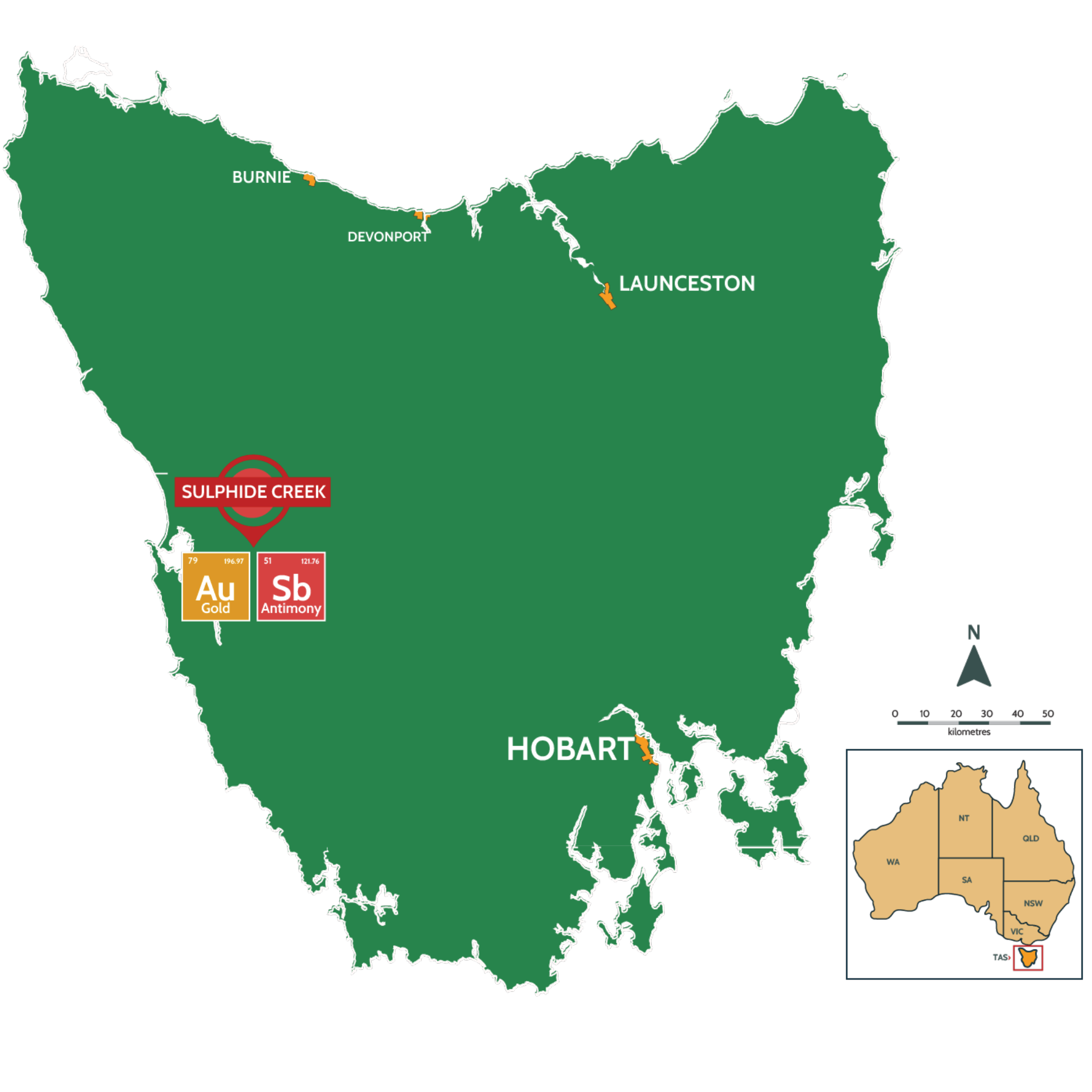 - Sulphide Creek Gold–Antimony Project (Tasmania): located in a prospective gold–antimony district, targeting high-grade vein-hosted gold and antimony mineralisation.